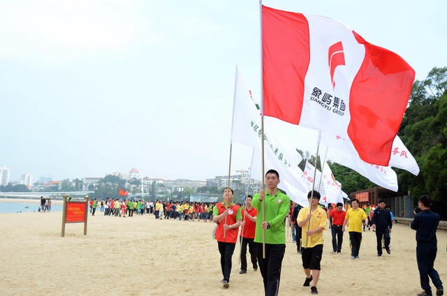 活動(dòng)啟動(dòng)儀式上,集團(tuán)公司黨委副書記、工會(huì)主席陳偉彬代表集團(tuán)領(lǐng)導(dǎo)班子向共建單位代表及全體員工致以節(jié)日的問候!陳副書記表示,我們要尊重勞動(dòng)、謳歌勞動(dòng)者;我們要倡導(dǎo)運(yùn)動(dòng),褒獎(jiǎng)優(yōu)勝者;我們崇尚遠(yuǎn)大的理想,憧憬美好的未來。海軍南方局李躍峰副政委對象嶼集團(tuán)在勇?lián)鐣?huì)責(zé)任、傳承愛心善行方面所作的努力高度贊揚(yáng),并表示這對深入培育當(dāng)代革命軍人核心價(jià)值觀方面具有十分積極的推動(dòng)促進(jìn)作用。隨后進(jìn)行了“象嶼集團(tuán)縱走俱樂部”授旗儀式,集團(tuán)總裁張水利為縱走俱樂部授旗,號(hào)召更多縱走愛好者“走在一起,樂在一起”!集團(tuán)及海軍南方局領(lǐng)導(dǎo)、十佳員工及志愿者代表鳴槍發(fā)令,全體人員在司旗的帶領(lǐng)下,向著音樂廣場出發(fā)了!